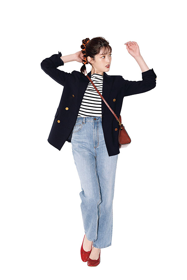ネイビージャケット×ボーダーカットソー×デニムパンツ