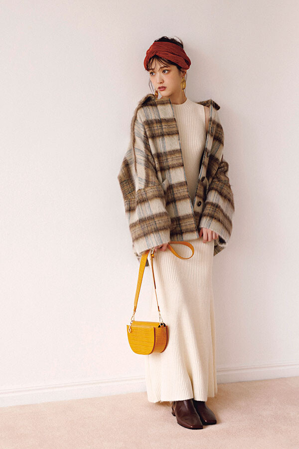 白ニットワンピース×チェック柄シャツ×ターバン